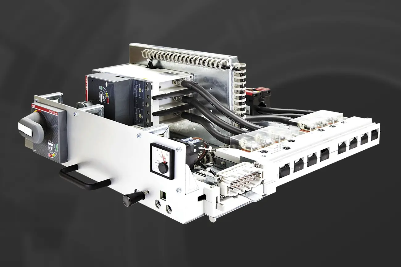 By combining the contact module with electrical switching and protection devices mounted on a common metal plate, a new draw-out technology is created.